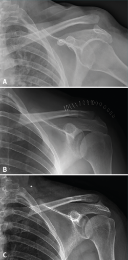 The MADOK technique was applied to a total of 19 patients between January 2015 and January 2020. Two subjects were excluded: one presented malunion of an associated fracture of the middle third of the clavicle, and corrective osteotomy was performed at the same time, while the other patient had undergone surgery for acromioclavicular instability on three previous occasions. Thus, the inclusion criteria were finally met by 17 subjects, of which 14 (82%) were available for evaluation an average of 2.7 (1.1) years after surgery (range 14 months - 5 years).