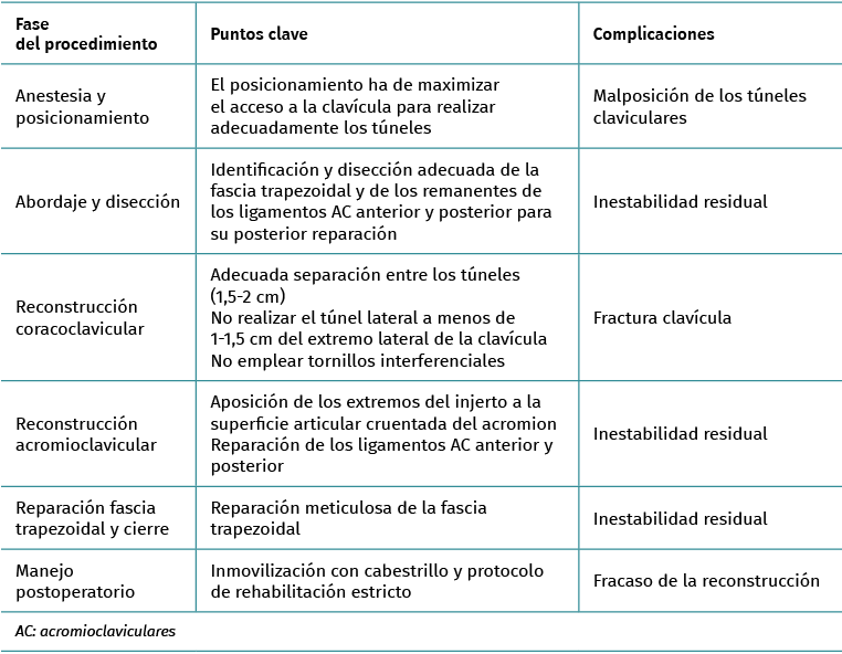 In order to achieve adequate joint reduction, it is essential to eliminate all the cicatricial tissue interposed between the clavicle and the acromion, produced over the chronic course of the lesion. In certain cases we also need to resect some marginal osteophyte that may impede reduction, but resection of the distal clavicle is not indicated, except in cases of extreme deformity of the latter, since resection could lead to a serious imbalance of the thoraco-scapulohumeral kinetics.