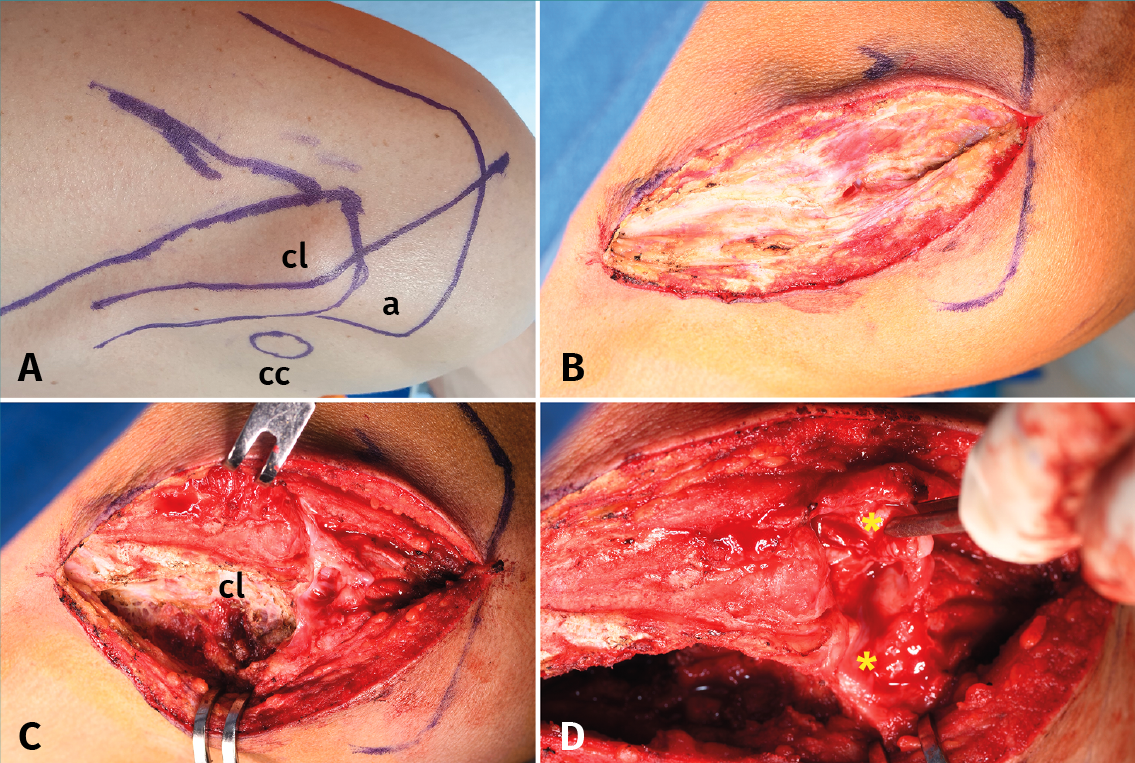 Figure 1. Approach and dissection. A: skin references and surgical incision; B: careful dissection of the trapezoidal fascia; C: exposure of the clavicle; D: identification and isolation of the acromioclavicular ligaments (asterisks). a: acromion; cc: coracoid process; cl: clavicle.