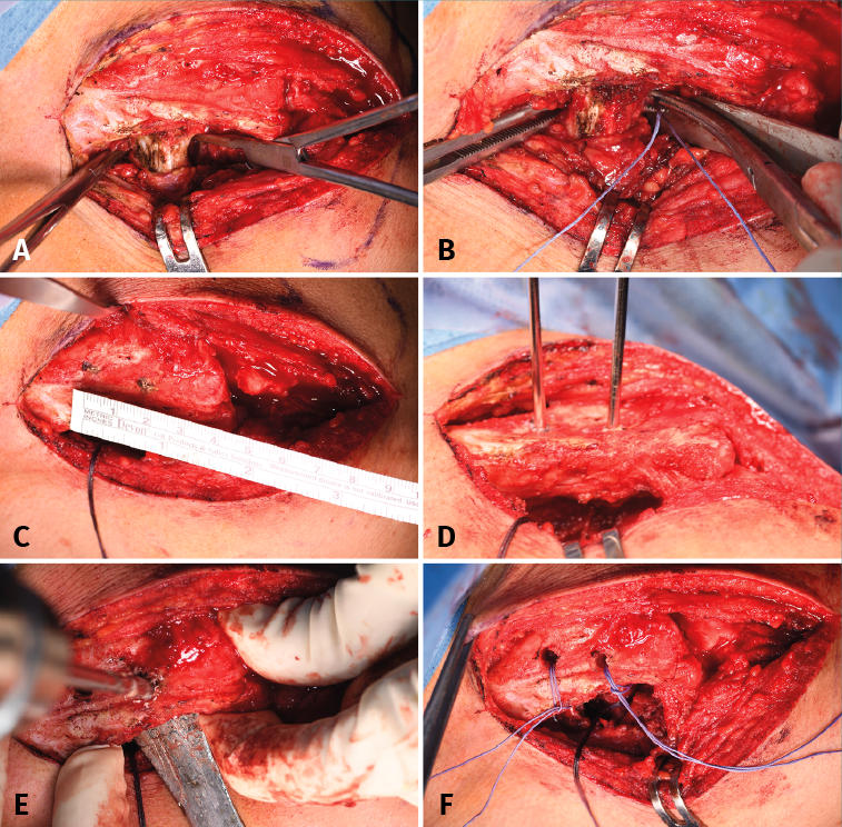 Figure 2. Coracoclavicular reconstruction. A: identification of the medial and lateral margins of the coracoid process; B: passing of the Vicryl® suture, folded in half, from lateral to medial, with the help of a Crawford; C: identification of the points where the clavicular orifices are to be made; D: placing of guide needles; E: perforation of the clavicular orifices with a 5-mm drill; F: insertion of respective Vicryl® sutures, folded in half, through the clavicular orifices.