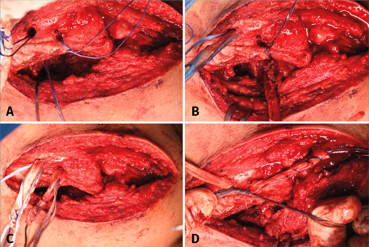 Figure 4. Acromioclavicular reconstruction. A: perforation of the orifices in the acromion for tunnelling of the graft; B: tunnelling in the posterior orifice; C: tunnelling in the anterior orifice; D: knotting of the sutures of the extremity of the graft over the lateral margin of the acromion.