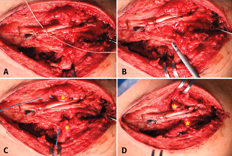 Figure 5. Acromioclavicular reconstruction. A: suturing of the two extremities of the tendon with high-resistance interrupted sutures; B: placement of the all-suture implants in the distal clavicle; C: passing of the suture through the acromioclavicular ligaments; D: final reconstruction of the ligaments. Asterisks: acromioclavicular ligaments.