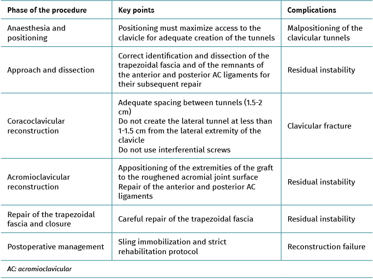 In our centre we chose the surgical technique of Carofino and Mazzocca(14) with the modifications introduced by Kibler et al.(15), since it allows combined reconstruction that restores both vertical and horizontal stability(2). In fact, with this technique we restore the function of the superior AC ligament, which has been shown to be the most important component for rotational and posterior stability(30). In addition, whenever possible, we also repair the rest of the AC ligaments(31). On the other hand, the use of grafts affords the biological adjunct to compensate the loss of healing potential seen in patients with chronic lesions. The fact that no interferential screws are used for plasty fixation allows us to use smaller diameter tunnels in the clavicle, thus preventing perioperative fractures and potentially reducing complications related with the material. Lastly, the use of a tape allows adequate primary fixation while graft incorporation takes place.
