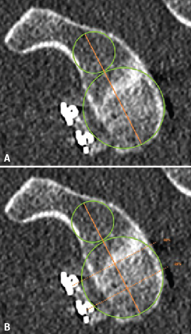 Taking the posteroinferior glenoid border as reference, we traced a first circumference over its contour, and a second circumference above the previous one and tangential to the glenoid borders. The line joining the centre of both circumferences was taken to represent the axis of the glenoid cavity. Over this we estimated the point corresponding to the half and 25% of the glenoid height (Figure 1). The sagittal section was used to determine the position of the graft in the craniocaudal direction (Figure 2). The length (in mm) of the bone defect was measured (B), along with the amount of bone graft covering the defect (A). Percentage covering of the bone defect was estimated from the ratio between A and B. The graft was considered to be well positioned when the percentage coverage of the defect was at least 90%.