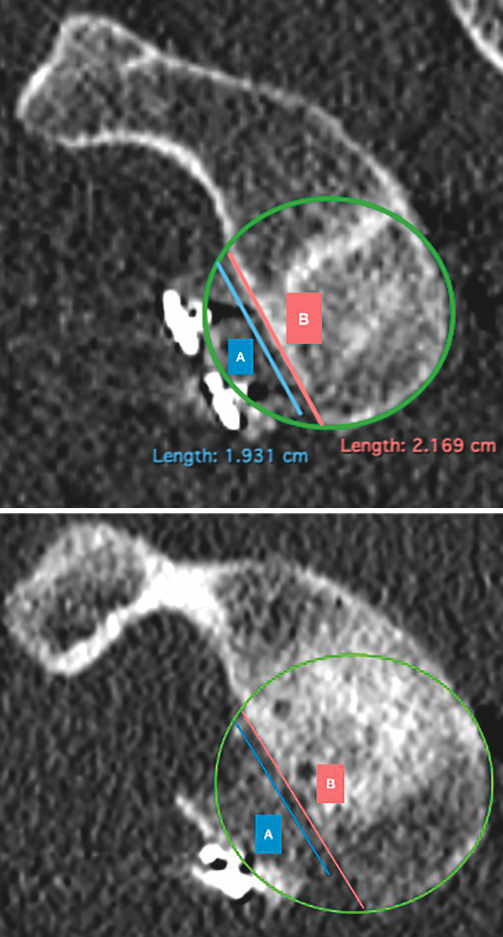 Figure 2. Evaluation of graft positioning in the sagittal section. Two lines are traced of a length equivalent to the size of the glenoid bone defect (B) and to the length of the graft covering the defect (A). Image A shows how most of the bone defect is covered by the graft - the latter therefore being considered to be well positioned. Image B shows that less than 90% of the bone defect is covered by the graft - the latter therefore being considered to be inadequately positioned.
