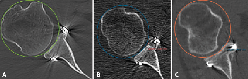 Figure 3. Evaluation of the graft position in the axial view, according to the description of Kany et al.(14). A circumference is traced over the glenoid border, and following the curvature of the latter, the amount of graft (in mm) extending beyond or failing to reach this line is measured. Image A shows the graft perfectly positioned, following the curvature of the glenoid concavity. Image B shows the graft medial with respect to the line. Image C shows the graft positioned too lateral.