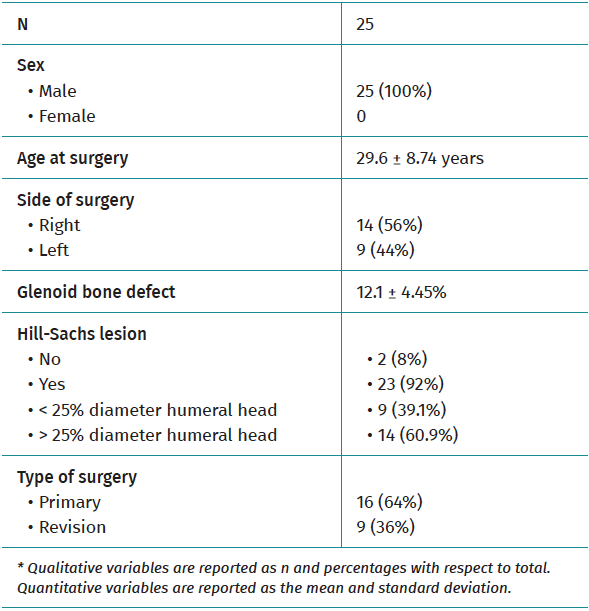 Iliac crest allografts were used in 13 patients (52%), and iliac crest autografts in the remaining 12 patients (48%). Capsulolabral repair was added to positioning of the bone graft in all cases, with infraspinatus plication using the remplissage technique in 16 of the 25 patients (64%). There were no intraoperative or immediate postoperative complications.