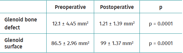 With graft implantation, we recorded a mean increase in glenoid cavity surface of 12.5 ± 3.8 mm2, and 17 patients (68%) showed complete restoration of the glenoid surface (Table 2).