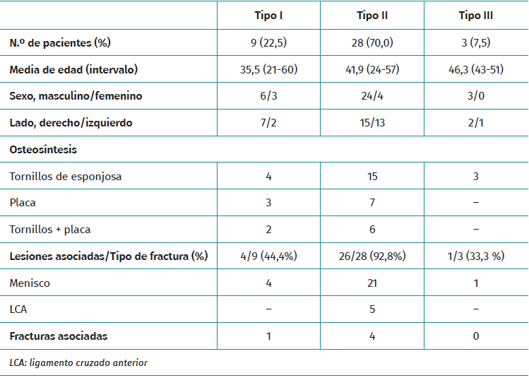 Resultados: la muestra incluyó a 33 hombres y 7 mujeres, con una media de edad de 43,2 años. Se trataba de 9 de tipo I (separación), 28 de tipo II (separación y hundimiento) y 3 de tipo III (hundimiento) según la clasificación de Schatzker. De los 40 pacientes incluidos, 31 tenían una lesión de partes blandas asociada que se detectó mediante artroscopia (77,5%). Se observaron desgarros meniscales en 26 de los 40 pacientes (15 lesiones del menisco lateral y 11 del menisco medial). La tasa más elevada de desgarros meniscales se observó en la FMT de tipo II (tipo I: 15,3%; tipo II: 80,7%; tipo III: 4%). Se observaron 5 roturas del ligamento cruzado anterior (LCA) en las fracturas de tipo II. Los desgarros meniscales fueron la lesión de partes blandas más frecuente.