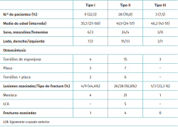 Conclusión: la FMT se asocia con bastante frecuencia a lesiones de partes blandas en más de la mitad de los casos (77,5%). Las lesiones meniscales constituyen la lesión simultánea más prevalente. La fractura de meseta tibial más común fue la de tipo Schatzker II, que fue la fractura que presentaba un mayor índice de lesiones de partes blandas asociadas.