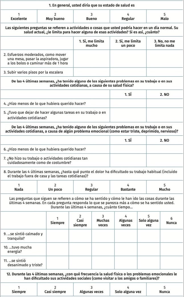The SF-12(13) (Table 2), as the short version of the SF-36(14,15), is a good example of a generic questionnaire, since it offers a general view of the patient health condition. Furthermore, it can be completed easily and rapidly. The scores of each of the dimensions of the SF-12 range between 0-100, where 100 indicates optimum health and 0 is the poorest score possible(14,15).