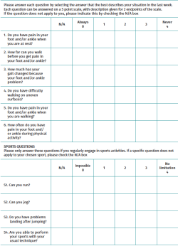 The FAOS is a questionnaire entirely self-completed by the patient. It comprises 42 items that evaluate the outcomes based on 5 subscales (pain, other symptoms, activities of daily living, sports and leisure activities, and quality of life related to the foot and ankle). It appears to be useful for evaluating outcomes that are relevant for the patient and addresses ankle stability following ligament reconstruction.