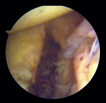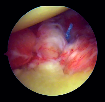Figure 1. View from the anterosuperior portal (left shoulder). Note the flat glenoid surface after drilling and roughening of the glenoid bed and deinsertion of the anteroinferior capsulolabral complex.