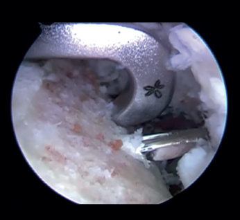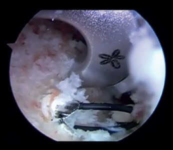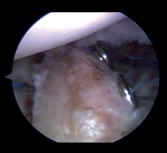 Figure 4. View from the posterior portal (left shoulder). Insertion of the graft by means of the traction threads and positioning in line with the bone defect.