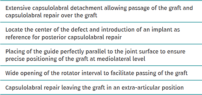 Arthroscope is introduced through the anterosuperior portal, and the glenoid guide is introduced through the posterior portal, and passed paralel to the glenoid surface until the hook is located at the centre of the bone defect. The guide is secured with two cannulas inserted through two small accessory incisions, until connecting with the posterior cortical layer. Both cortical layers are drilled through them using a 2.8 mm drill fitted with a sheath so that on withdrawing the drill the sheath is positioned at drilling level. This step is made twice to introduce two sheaths: one above and the other below the glenoid guide hook and spaced 10 mm apart. Through these sheaths we advance two monofilament loops that are retrieved sequentially through the anterior portal for subsequent passing of the graft. At this point we can remove both sheaths and the glenoid guide, taking care to prevent the guide hook from coming into contact with the glenoid surface in order to avoid damaging to the cartilage.