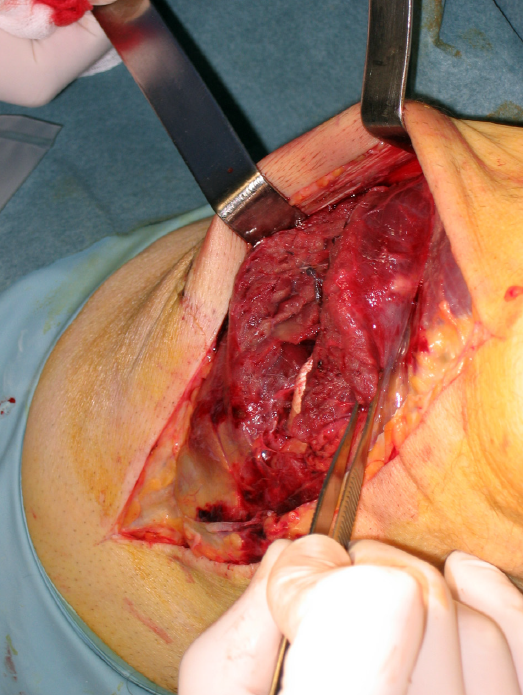 Figure 1. Right thigh. The head is to the left of the image. Complete sectioning of the vastus medialis, rectus femoris and vastus intermedius caused by the fall of a blunt and very heavy object (the edge of a metal door, from a height), with the knee flexed. Surgical approach for suturing the different muscle bellies.