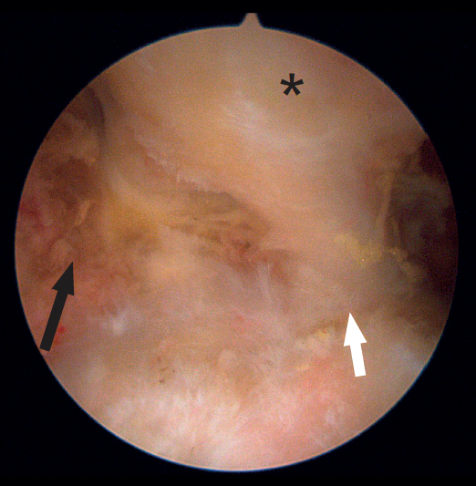 Figure 2. Endoscopic view of the tendon of origin of the left rectus femoris. The optics are located anterior to the joint capsule of the hip (which occupies the floor of the image). Note the direct tendon (black arrow) originating in the anterior inferior iliac spine, the reflected tendon (white arrow) originating in the supra-acetabular region, and the combined tendon formed by the joining of the previous tendons (asterisk).