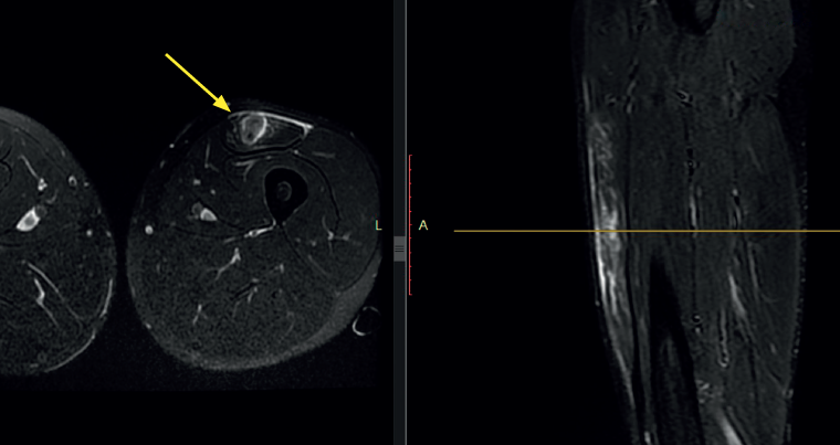 Figure 4. Magnetic resonance imaging scan of the left thigh in axial and sagittal view (T2). Bull's eye sign in a lesion of the left rectus femoris, causing edema around the central tendon and edema of the surrounding muscle tissue (yellow arrow).