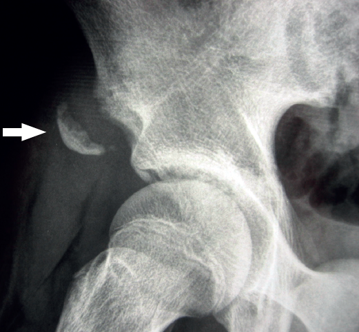 Figure 6. Alar radiographic view of the right hip of an adolescent. Apophysiolysis of the anterior inferior iliac spine secondary to traction of the tendon of the rectus femoris of the quadriceps. The arrow indicates the avulsed bone fragment.
