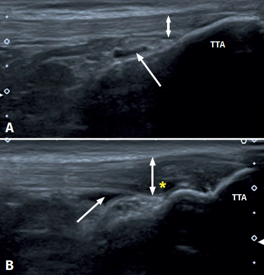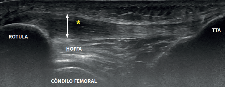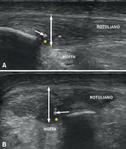 It is also common to identify cortical irregularities in the proximal enthesis of the tendon at the point where it joins the patella, involvement of the paratendon and adherences to Hoffa's fat pad. Any calcifications will be seen as white hyperechogenic zones (Figure 5).
