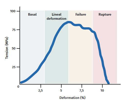b) Deformation less than 4% (linear region). Represents the limit of the physiological deformation, and its slope is indicated by the elasticity modulus (Young's modulus).