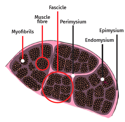 The skeletal muscle cell is multinucleated, cylindrical and possesses contractile capacity. Each cell is covered by connective tissue, forming an envelope known as the endomysium. The perimysium in turn is the connective covering enveloping a group of muscle cells, forming fascicles, connective tissue tunnels and intramuscular septae that traverse the muscle belly and provide an entry route for arterioles, venules and nerves. In turn, the entire muscle is enveloped by a thick layer known as the epimysium, which separates it from the surrounding muscles. These layers of connective tissue can continue with the fibrous tissue that forms the tendons, and proves to be essential for transmission of the force generated by the muscle cells to the skeletal structures(25)(Figure 5).