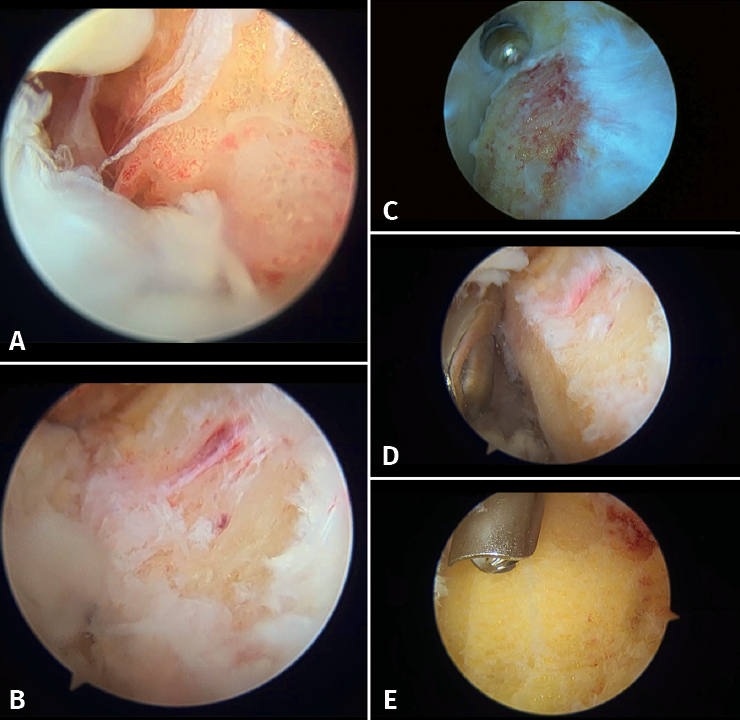 Then, where applicable, and combining the drill and synoviotome, we resect the bony prominence of the tuberosity (Figure 7C and 7E).