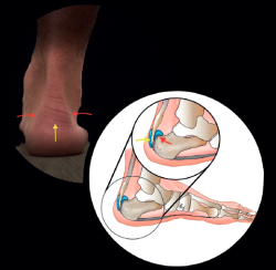 - Retrocalcaneal bursitis: inflammation of the bursa located in the recess between the anteroinferior portion of the Achilles tendon and the posterosuperior surface of the calcaneus (retrocalcaneal recess). This condition results in visible and painful inflammation of the soft tissues medial and/or lateral to the tendon at the height of the posterosuperior region of the calcaneus. The plain radiographs often reveal a prominence of the posterosuperior tuberosity of the calcaneus. The histopathological findings comprise degeneration of the walls of the bursa, with synovial hypertrophy and presence of fluid.
