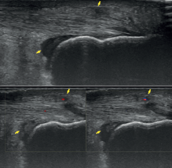 Ultrasound allows us to identify inflammatory signs in both bursae, tendon lesions and bone exostosis. Tendon degeneration is characterised by poorer echogenicity (a lower mean value on the scale of greys), due to the lesser organisation and altered composition of the tendon microstructure(21). Doppler ultrasound in turn allows us to assess neovascularisation zones (Figure 4). Ultrasound offers dynamic exploration and is operator-dependent.