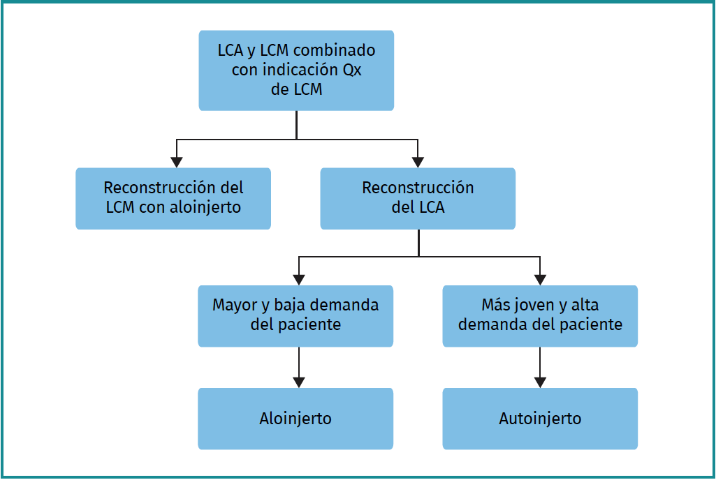 The surgical management of combined ACL and MCL injuries constitutes a significant challenge, due to their complexity. The decision between treating the MCL conservatively or surgically directly impacts upon the outcome of ACL reconstruction. The reviewed studies indicate that MCL surgery reduces the risk of ACL revision compared to conservative treatment, which involves a greater risk of complications. In addition, consideration should focus on the choice of graft, as well as on the management of anteromedial laxity, in order to optimise the surgical and functional outcomes.