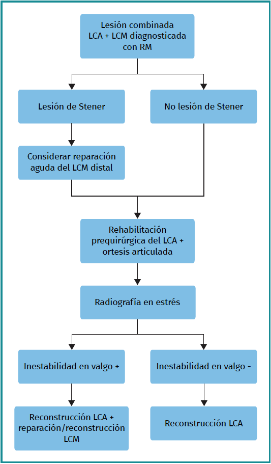 After the physical examination, the indicated imaging studies include radiographs (Rx), with stress Rx in some cases, and magnetic resonance imaging (MRI). Once the diagnosis of combined ACL and MCL injury has been made, the most appropriate treatment is decided on an individualised basis.