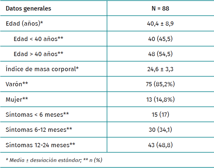 Eighty-eight hips were included in the study. The epidemiological variables and symptoms evolution time are shown in Table 1.