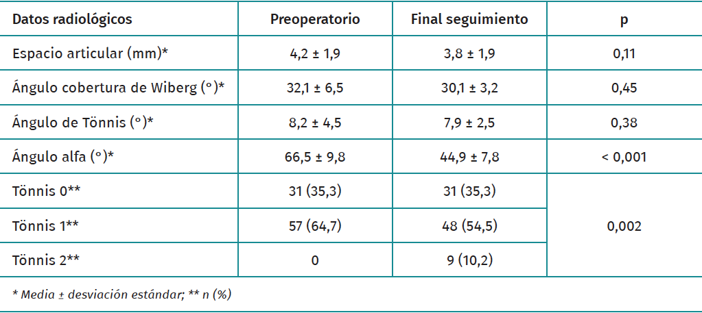 The radiological variables recorded preoperatively and at the end of follow-up are shown in Table 2. The mean degree of correction of the alpha angle was 21.6° (SD: 10.4°), the decrease being statistically significant. Nine patients (10.2%) progressed from Tönnis stage 1 to 2 at the end of follow-up.
