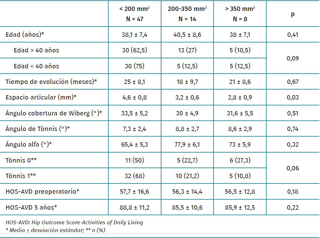 The analysis of patients with the measurement of chondral lesion size revealed a significantly lower preoperative joint height in patients with lesions > 350 mm2(Table 4). Of the 9 patients who progressed from Tönnis stage 1 to 2, a total of 5 had a chondral lesion > 350 mm2. In turn, the four patients who required revision AHS and two patients who required conversion to THR at 59 and 62 months of follow-up had a chondral lesion > 350 mm2. None of the patients with a chondral lesion < 350 mm2 experienced worsening of their degree of joint degeneration or required reoperation.