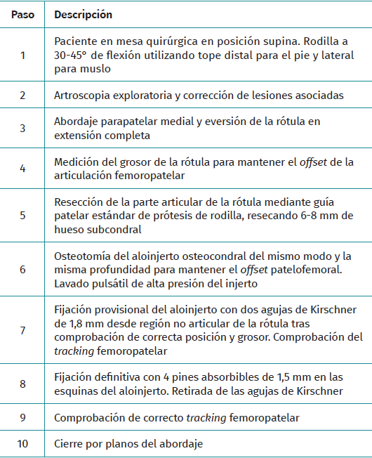 After correct orientation of the osteochondral graft in the recipient bone and verification that the previous patellar thickness is maintained, temporary fixation is performed using 2 or 3 K-wires of 1.8 mm from the non-articular part of the patella (anterior to posterior), avoiding cartilage injury.