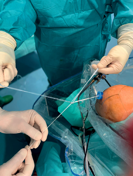 Once the tunnel has been drilled, the guide is removed from the inside of the drill and another retriever thread is inserted through it. This thread is extracted using grasping forceps inserted through the cannula from the anteromedial portal to outside the knee (Figure 7), where it is likewise secured, as was already done with the femoral retriever thread.