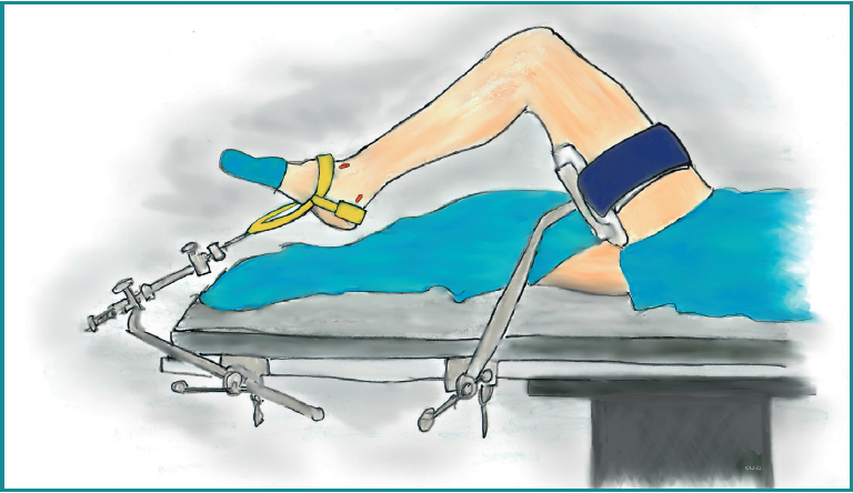 Initially developed by Jim Guhl, the fixed distraction technique was designed to enhance diagnostic capabilities and visualization of ankle joint pathologies, including posterior cartilage lesions and other posterior joint conditions, through an anterior approach(18). This method employs a mechanical device to apply consistent tension to the ankle joint, thereby increasing the intra-articular space and allowing improved access to posterior articular cartilage lesions and other posterior structures (Figure 1). Traditionally, this technique has been performed using small-diameter arthroscopes and instruments(18). Posterior pathologies, such as os trigonum syndrome, were addressed using the same setup with the addition of lateral and posterolateral portals(18). At that time, the posteromedial portal was considered a "no-go area"(8,18).