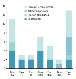 Resultados: se obtuvieron 56 fracturas de calcáneo que corresponden a 51 pacientes, con una media de edad de 44,7 años. El 44,64% recibió tratamiento conservador, en el 39,28% de los casos se usó placa de reconstrucción; los métodos de fijación percutánea se usaron en el 7,14% de los casos; se optó por artrodesis subastragalina primaria mediante clavo Vira® en el 8,92% de los casos estudiados. La escala de AOFAS obtuvo una puntuación promedio de 80,61 (DE: 11,85). El 78,6% fue valorado como resultados excelentes-buenos, el 21,4% como regulares-malos. Al comparar los resultados clínicos con el ángulo de Böhler postintervención, se encontró que la mayoría de los pacientes en los que se obtuvieron ángulos normales o planos los resultados clínicos fueron excelentes-buenos.