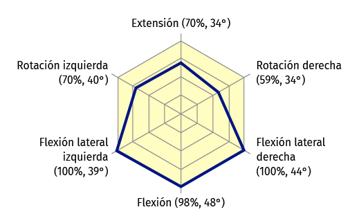 Resultados: la primera valoración biomecánica muestra alteración de la movilidad cervical. Ante estos resultados y persistencia de dolor, se realiza nueva prueba biomecánica a los 2 meses, siendo en este caso el resultado de movilidad funcional normal.