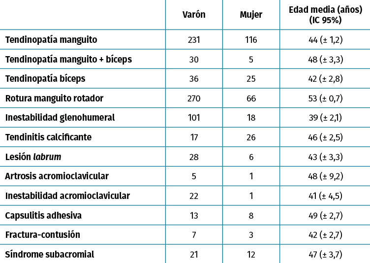 Material and methods: retrospective observational study of 1069 patients. Inclusion criteria: patients treated in our center with pathology related to the shoulder region during the period from January 2011 to December 2016.