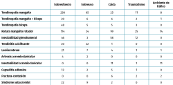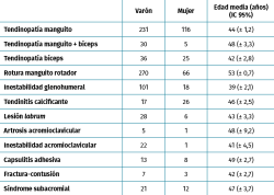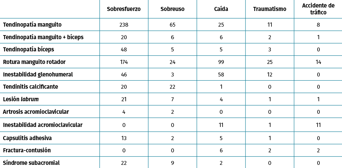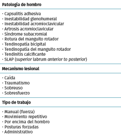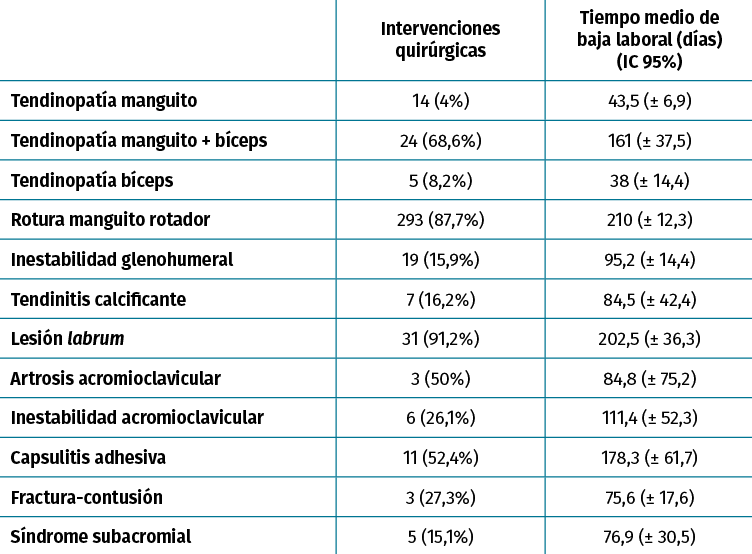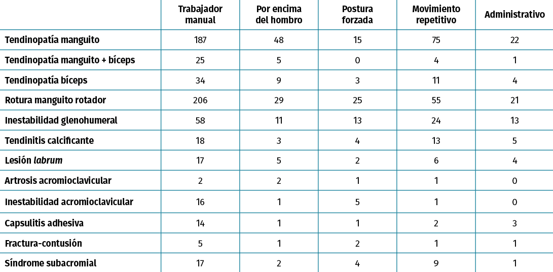 Resultados: las patologías más prevalentes fueron la tendinopatía de manguito con un 32,6% de los pacientes, la ruptura del manguito rotador (RMR) (31,9%) y la inestabilidad glenohumeral (11,1%). Los factores de riesgo más frecuentes observados fueron realizar un trabajo manual de fuerza (55,9% de los casos), con movimientos repetitivos (18,9%) y con movimientos y cargas por encima del hombro (10,9%). Respecto a los mecanismos lesionales, el predominante en la muestra fue el sobresfuerzo (56,7%), la caída (20,8%) y el sobreuso (13,5%). Las patologías que supusieron más días de baja laboral fueron la RMR con 210 (± 12,3) días, la lesión de labrum, con 202,5 (± 36,3) días y la capsulitis adhesiva con 202,5 (± 36,3) días.