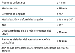 Scapula fractures are rare, often due to violent trauma and associated with other serious injuries that can endanger the patient’s life. Most are treated conservatively with good results because it is a very vascularized bone, they are usually little displaced, and the scapular waist can compensate a certain mobility deficit. However, in some scenarios, such as limits of displacement and angulation or injuries associated with other concomitant fractures, it has been seen that conservative treatment does not give good results and surgical treatment does. In this article we try to establish criteria, based on works of other authors, from which it is better to treat these fractures surgically instead of conservatively.