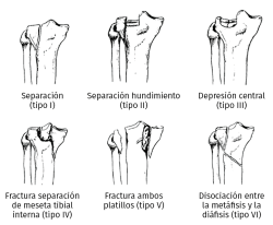 Introducción: las fracturas de meseta tibial suponen el 1% de las fracturas del aparato locomotor, siendo la afectación de la meseta tibial externa la más frecuente. Se trata de fracturas intraarticulares generadas por un mecanismo de compresión axial y lateral en su mayoría, siendo menos frecuente que se produzcan por un mecanismo axial puro. Encontraremos distintos tipos de fracturas según el grado de flexoextensión de la rodilla en el que se produzcan. Podremos clasificarlas tradicionalmente mediante la clasificación de Schatzker, que divide las fracturas de meseta tibial en 6 tipos o, debido al avance de la tecnología, mediante clasificaciones mayormente reproducibles inter- e intraobservador, como pueden ser la clasificación de Luo o la de las 4 columnas de Chang.