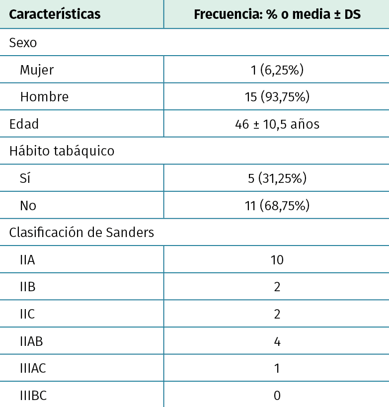 Resultados: se evaluaron 16 pacientes con 18 fracturas (15 hombres, 1 mujer). Clasificación según Sanders (10 pacientes de tipo IIA, 2 pacientes IIB, 1 paciente IIC, 4 pacientes IIIAB, 1 paciente IIIAC); 15,7 ± 6,5 días hasta la cirugía; tiempo de ingreso 3 ± 1 días; tiempo en descarga 7,7 ± 1,1 semanas; ángulo de Böhler precirugía 15,1 ± 8,8°, poscirugía 25,2 ± 7,8° y a los 3 meses 26 ± 8,9°; ningún paciente tuvo problemas de la herida, 3 pacientes presentaron afectación del nervio sural y uno requirió revisión en quirófano. Tres pacientes necesitaron infiltración subastragalina y uno de ellos requirió artrodesis posterior.