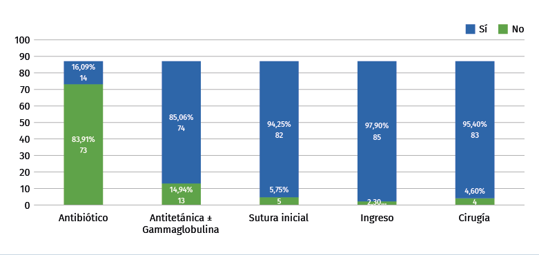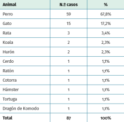 Results: during the study period, 87 cases of animal bites were treated in the emergency department, the most frequent being those caused by dogs. The patients attended mostly performed work related to animal care or training. 75.8% of the injuries occurred in the upper extremities and most were superficial wounds (73,5%). Antibiotic therapy was the most commonly used treatment (83.9%), with amoxicillin-clavulanic being the most frequently prescribed. In 48,2% of cases, work leave was required.