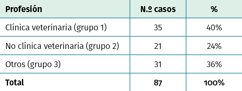 Resultados: en el periodo estudiado se atendieron en urgencias 87 casos de mordedura animal, siendo las más frecuentes las ocasionadas por perros. Los pacientes atendidos realizaban mayoritariamente trabajos relacionados con el cuidado o adiestramiento animal. El 75,8% de las lesiones se produjeron en las extremidades superiores y la mayoría fueron heridas superficiales (73,5%). La antibioterapia fue el tratamiento más empleado (83,9%), siendo amoxicilina-clavulánico el prescrito con más frecuencia. En el 48,2% de los casos fue precisa la baja laboral.