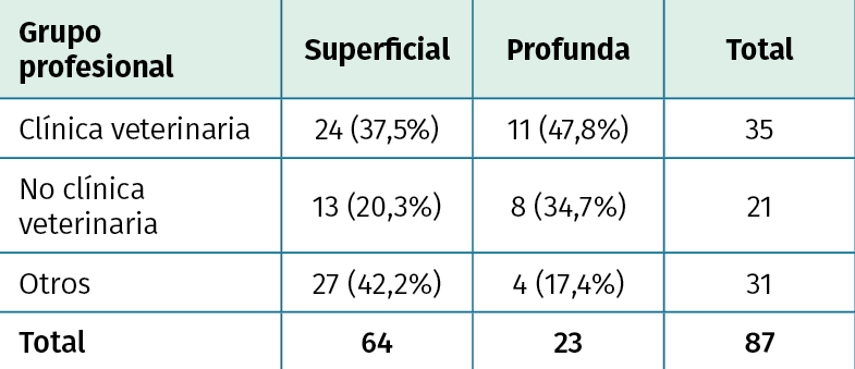 Conclusions: bites are common injuries in professionals related to animal care but also occur in other groups of workers, finding that most are superficial and produced by dogs; they are located mainly in upper extremities. In a high percentage they are treated with antibiotic therapy, with amoxicillin-clavulanic being the most used. The leave of work was precise in almost half of the cases, being more frequent in the staff of veterinary clinics.
