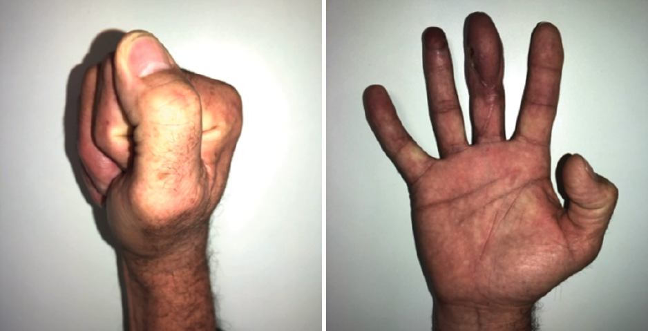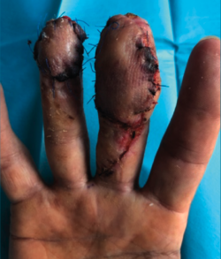 Surgical treatment for multiple finger skin and soft tissue loss represents a challenge for the plastic surgeons. Free flaps used as a temporary syndactyly may be the treatment of choice for this kind of injuries. It provides full coverage of all the finger and hand defects with one single flap, minimal sequelae and fast return-to-work rate.