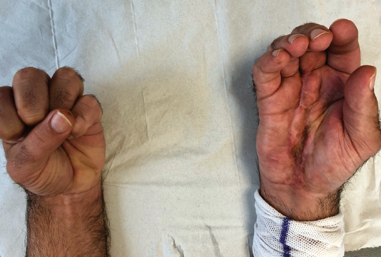 Conclusión: el tratamiento fisioterápico, aplicado en este caso de forma intensiva en tratamiento diario, en turno de mañana y turno de tarde, ha permitido la recuperación funcional de una mano que se preveía catastrófica.