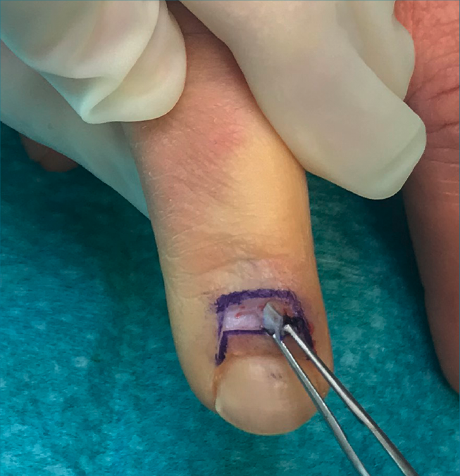 Discusión: el colgajo eponiquial es una técnica sencilla y práctica que mejora la estética y la funcionalidad tras las amputaciones distales de los dedos evitando la comorbilidad asociada y las deformidades ungueales de otras técnicas descritas de reconstrucción de la lámina ungueal, como las transferencias osteo-onicocutáneas de los dedos del pie.
